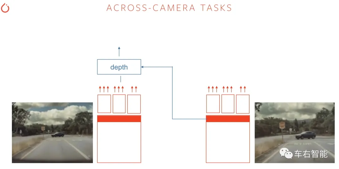 据小编所知,一个是CNN采用了ResNet-50结构,另一个是识别目标距离时,会使用多个摄像头的特征结果进行距离预测,如下图。这是一个所谓的“Across CameraTasks”,两个焦距不同的前向摄像头,在各自的主干CNN给出的特征图基础上,经由Depth模型(DNN模型)给出目标的距离预测值。我们推向模型训练的真值,是以毫米波雷达的测量值为基础的。
