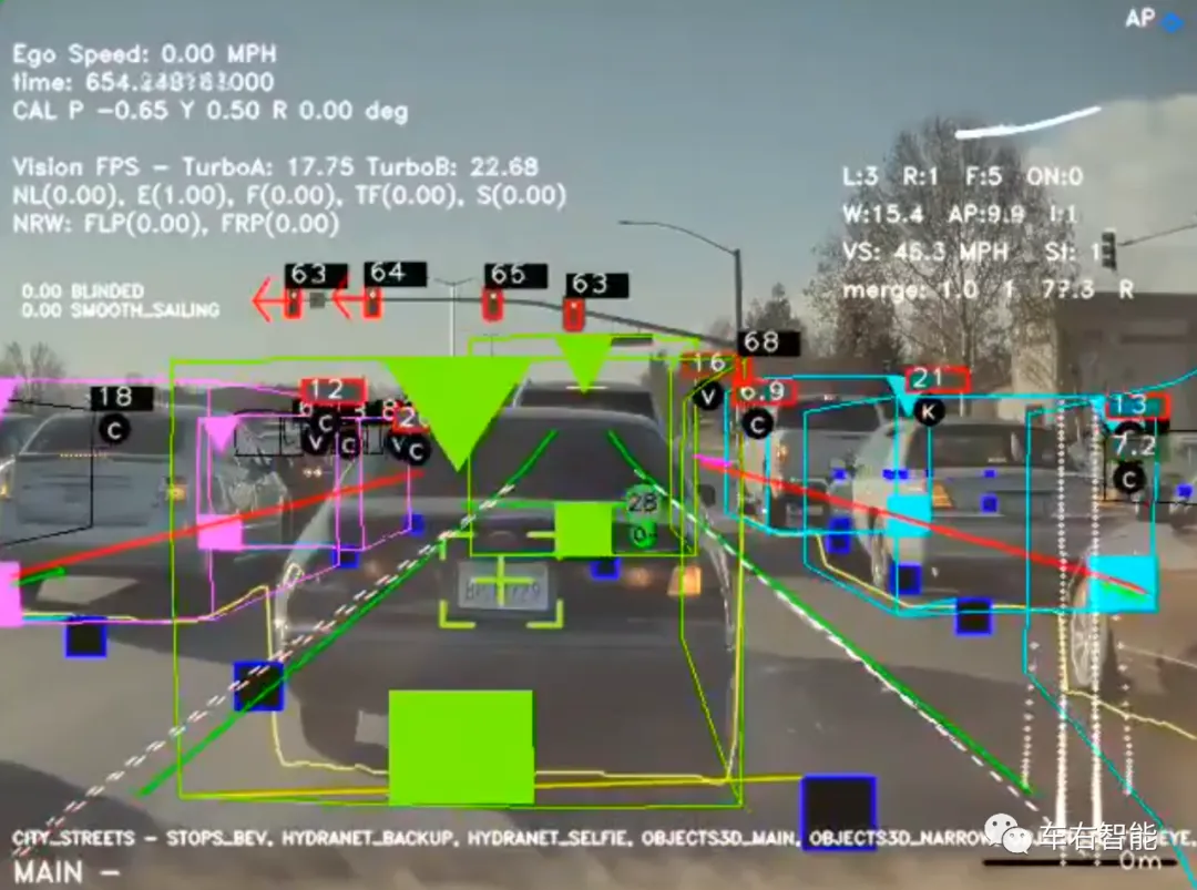 2 关于CutinExcited(Pro 0.78),是一个闪现值,不会始终出现在UI中。但根据小编的观察,在车辆运行到路口红灯前降速滑入等待状态的过程中,Cut-in的预测总是很活跃地闪现。根据之前Karpathy演讲的公开资料,Autopilot中对于相邻车道行驶车辆是否会执行Cut-in操作的判断并非由代码固化人类经验来判断,而是完全有DNN神经网络来做判断,换句话说,Cut-in Excited指标的高和低,是由模型给出。我们可以做个设想,当邻道车辆密集且保持一定的速度范围,也有可能还带一些小幅度的偏转驾驶轨迹……往往就是现实世界中发生大量换道操作的时机,因此被训练出来的DNN模型,就会在这种场景下高频次输出Cut-in Excited的高置信率指标就不足为怪了。