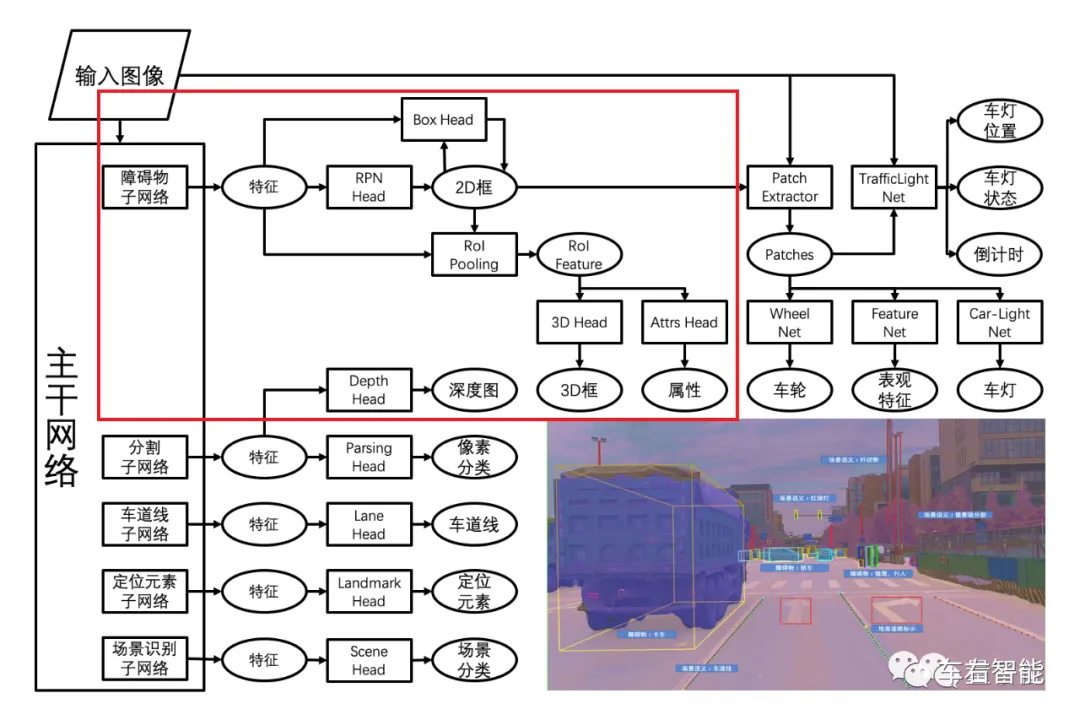 另,关于目标车辆识别,在上期文章中我们提到了Apollo Lite的视觉识别系统,相关的技术文章其实也就看到一篇,但是百度的相关专利和技术文章都是可以查到的,所以资料更多一些。小编这里把相关内容再贴一次,因为对于我们理解和推测Autopilot视觉系统的能力到底如何非常重要。Tesla目前的公开信息集中在Autopilot大系统的训练和实现方法的介绍上,对于具体的网络模型和结构基本没有涉及。而Apollo Lite这方面的信息和公开技术论文就比较多一些,比如下图是整体的Apollo Lite的视觉识别DNN网络框架: