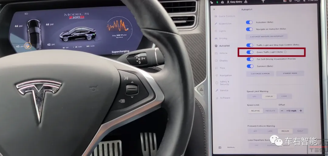 关于功能2,Green Traffic Light Chime(交通绿灯状态声音提醒)是一个比较直观的功能,很容易理解。即在Tesla车辆满足一定条件(包括车辆自身控制状态以及外部道路交通灯状态的条件下),红灯变绿灯时,仪表盘会给出声音提醒。提醒人类驾驶员Tesla车辆此时的两种状态,一种是红灯变绿,驾驶权在驾驶员手上时,提醒人类驾驶员起步前行;第二种是绿灯状态下,当Autopilot自动引导车辆通过路口时,提醒人类驾驶员确认路口交通状态。
