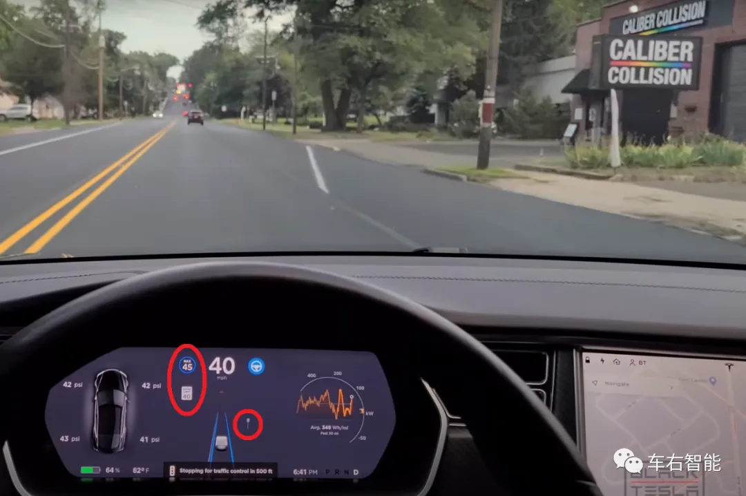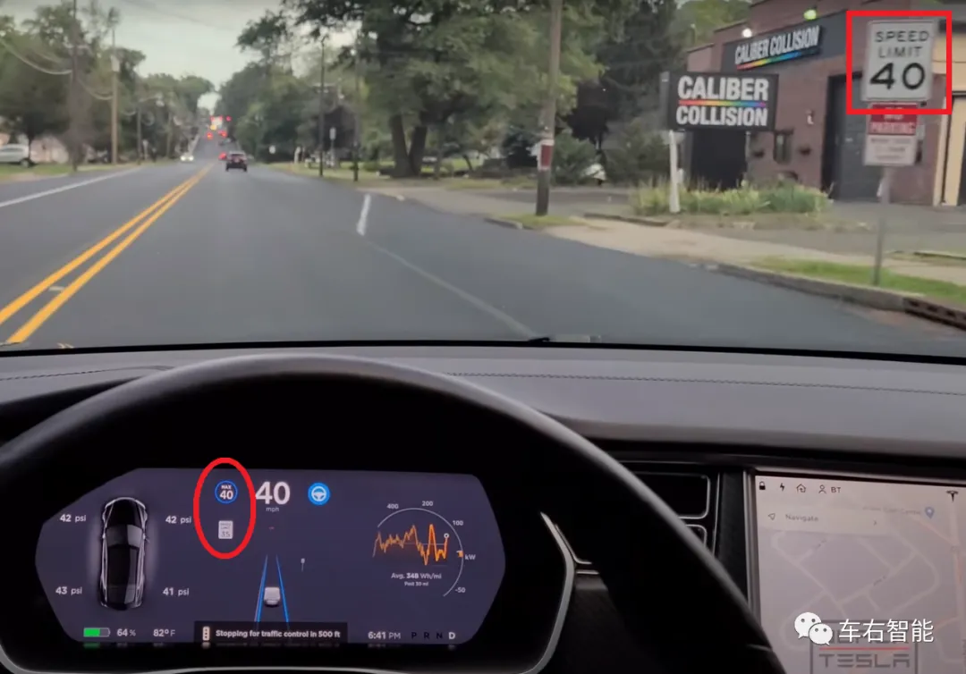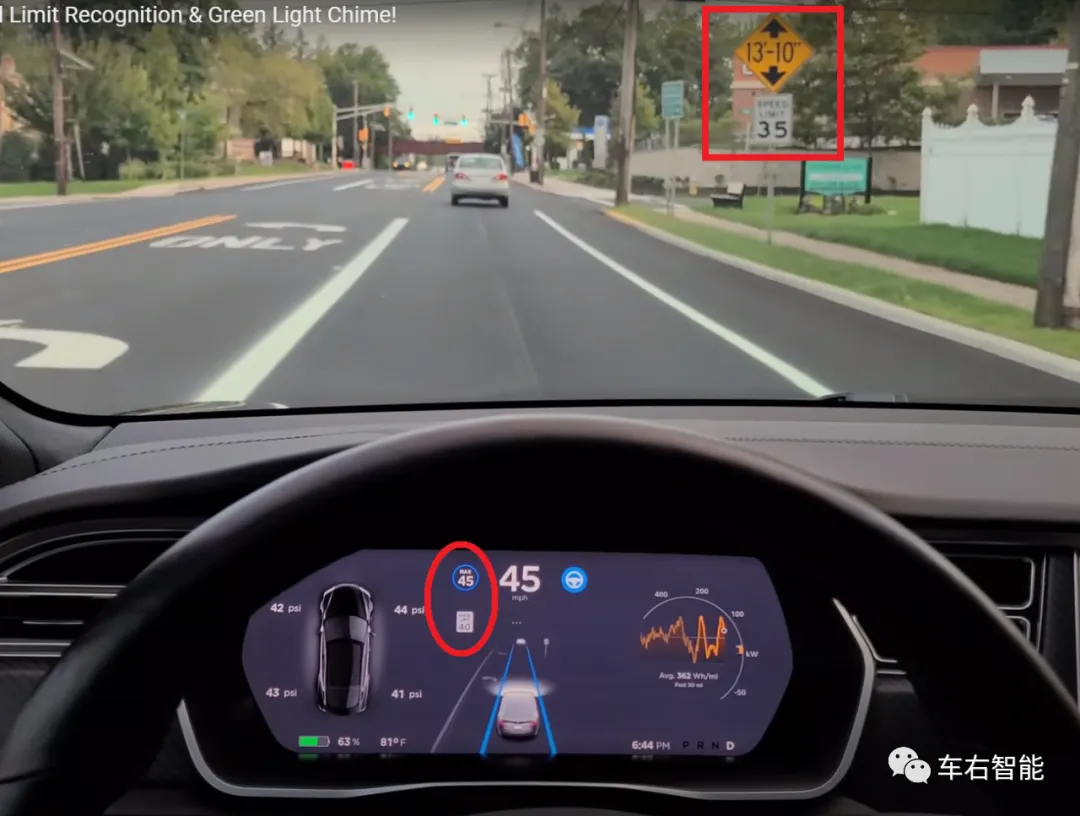 相对地,以上两张连续图片,显示了限速的降速过程。当车辆识别到35mph的速度限制标志时,自动完成了车辆的速度限制更新。