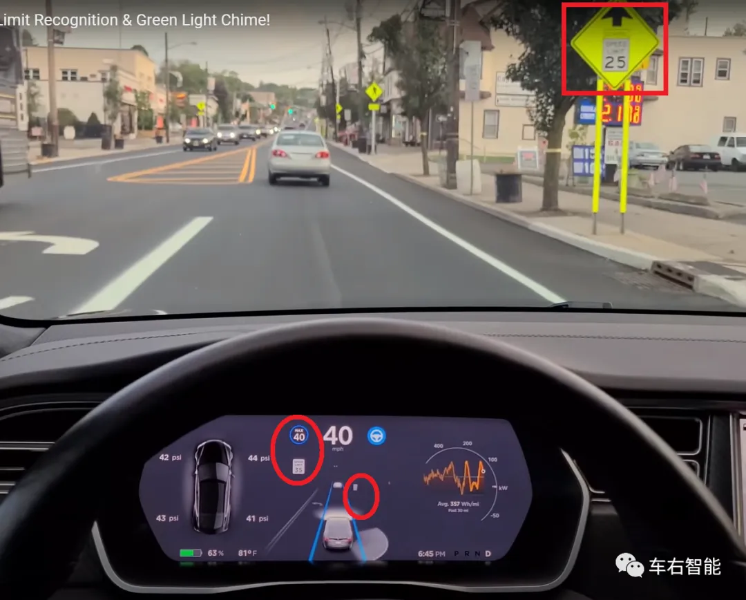 当车辆行驶到速度限制标志(40mph)前时,车辆此时的速度限制是35mph,巡航速度上限为“上浮”的+5mph为40mph(注意,上浮机制是经由驾驶员设定的)。当通过速度限制标志之后,车辆的速度限制显示更改为40mph,再加上“上浮”的+5mph,则此时的巡航速度上限变为45mph。基本上是瞬间发生的。同时可以注意到,在仪表板的路况动画中,速度限制标牌被识别并显示出来。