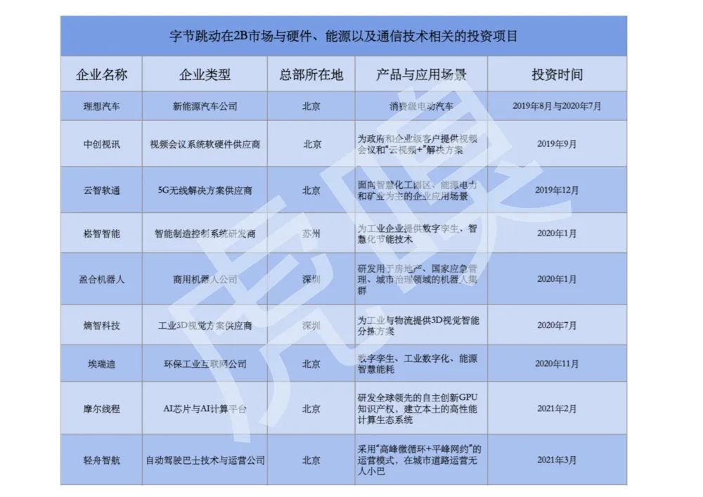 字节跳动虽然投资相对低调,但其实一直在对以交通、新能源为核心的城市建设市场“埋点”。根据公开的投资信息,字节跳动在2019年开始便加大了对2B市场相关技术领域的投资,2021年只是延续了这个势头: