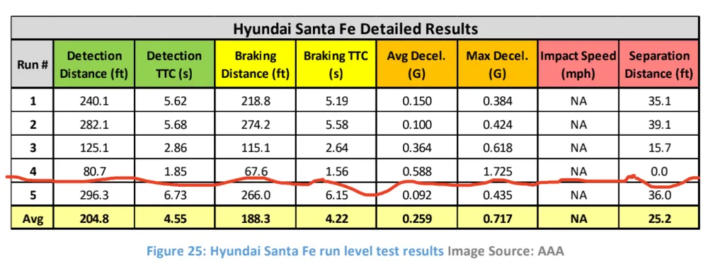 现代圣达菲在5次测试中的三次表现良好——检测与启动刹车系统之间保持了足够距离,司机有充分时间被通知。然而,在第3次、第4次的测试中发生了“意外”: