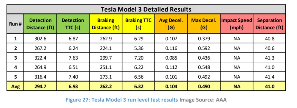 不过,虽然Model3的平均检测距离为317.3英尺,但平均2.89秒后才启动刹车。这与其在A1场景中的表现差距较大——在检测到车辆后平均0.42秒就开始刹车。