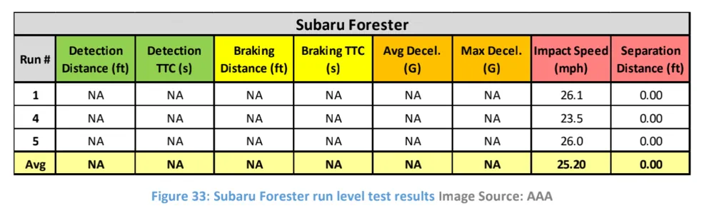 不过,斯巴鲁森林人虽然检测到前车,但从数据来看,启动刹车最晚,因此相比之下刹车会相对猛烈一些。