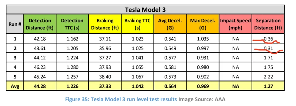 不过,研究员们发现,Autopilot 第1、2测试的人车最终距离明显缩短(下图)。虽然并未发生任何碰撞,但在特定测试速度下,特斯拉的系统在整个制动过程中的响应可能存在误差。