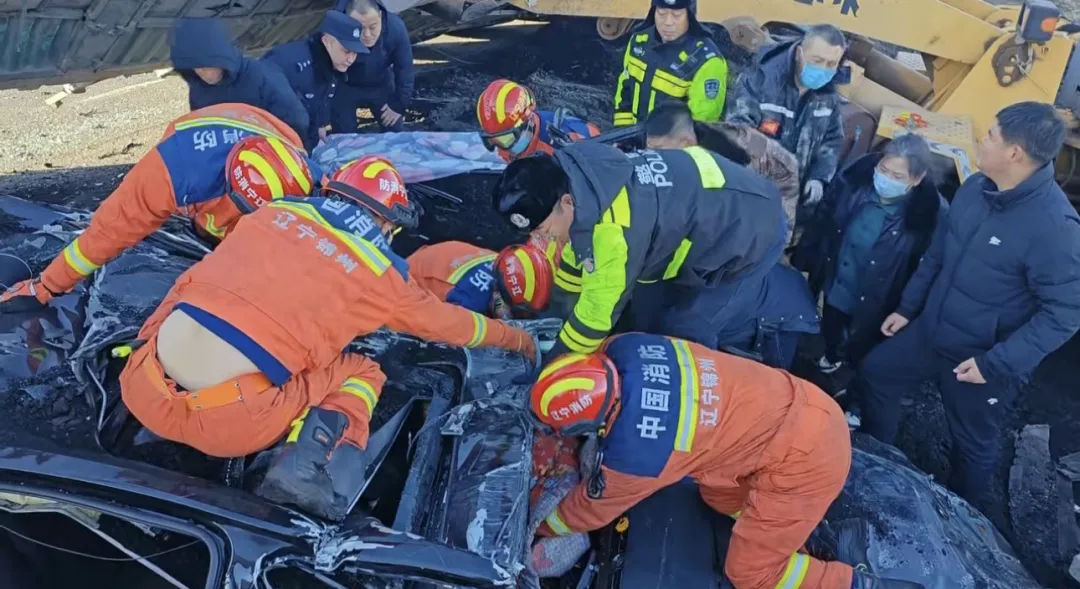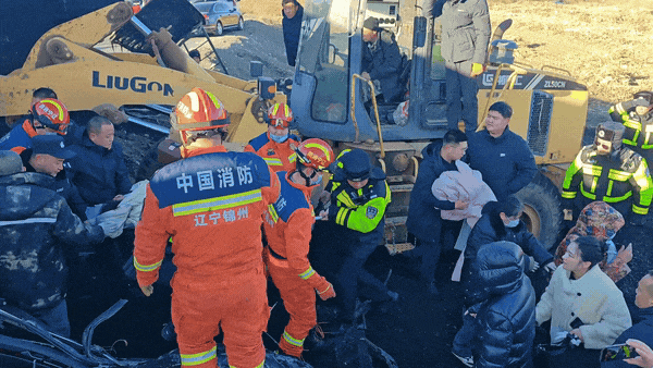 接到报警后,义县公安局交通管理大队立即启动应急预案,迅速联动消防部门和乡镇政府,火速奔赴现场展开救援。现场,轿车被掩埋在煤堆之下,救援难度极大。交管大队现场指挥人员协调多方力量,紧急调集挖掘机、铲车清理主体煤堆,救援人员顶着寒风,用铁锹甚至徒手清理轿车周围煤炭。为安全施救,现场指挥吊车、铲车协同作业,将货车厢体顶撑稳固,并用铲车小心地将轿车从危险区域移出,严防二次伤害。