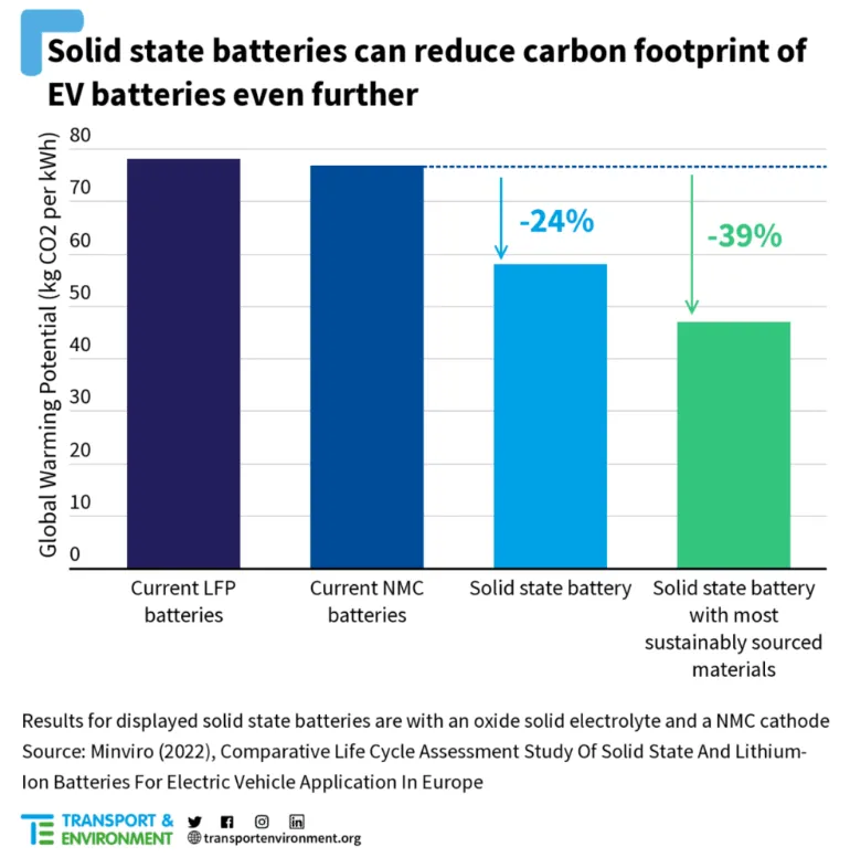 这意味着电池生产和使用的温室气体排放量更低,从而增强了电动汽车相较于燃油车的整体气候优势。这些减排主要得益于固态电池所需原材料更少且能量密度更高,因此与传统电池相比,它们能以更低的制造影响储存更多电能。