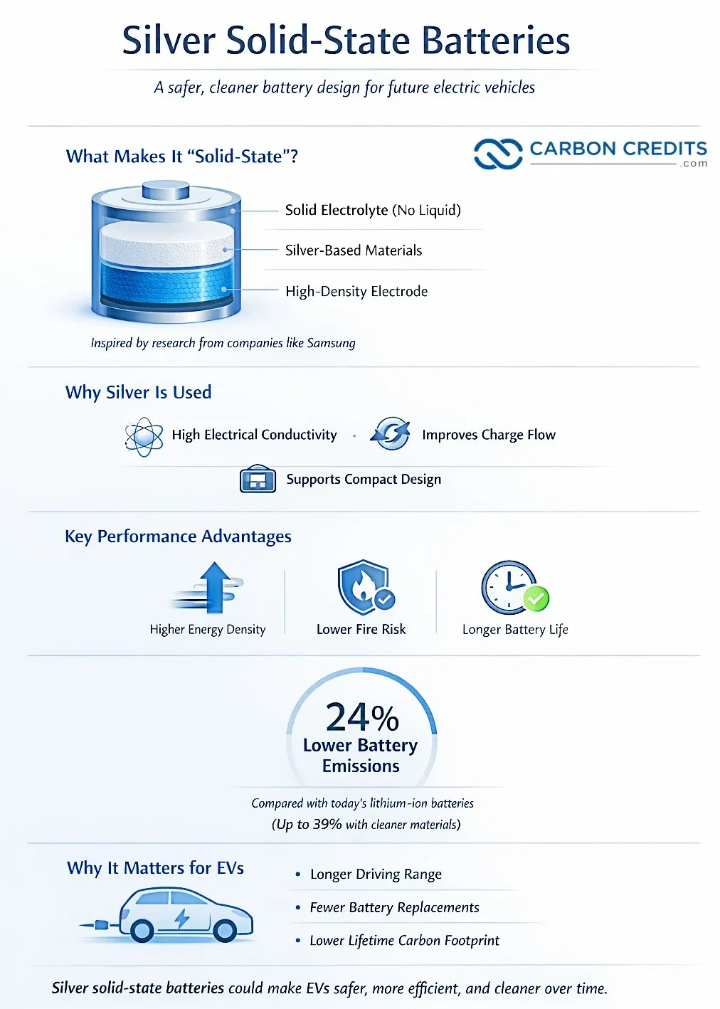 此外,相较于当前锂离子电池,固态电池有助于降低电动汽车电池的碳足迹。研究表明,其设计可减少约24%的碳排放;若采用更可持续的材料与供应链,减排幅度最高可达39%。