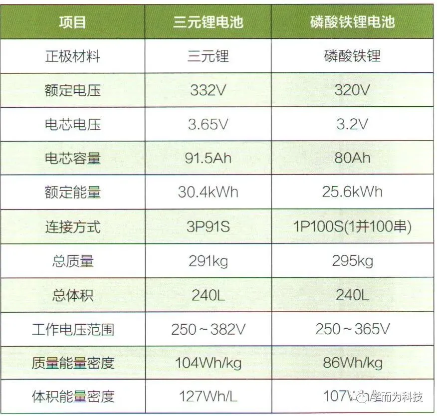 电池包容量((Ah)=模块容量=单体容量×并联单体个数。电池包能量(VAh)=电池包额定电压×电池包容量。可以看出,并联单体的个数越多容量越大,串联模块的个数越多能量越大。例如EV200磷酸铁锂电池包额定电压320V,额定容量80Ah,电池包能量=320× 80=25.6kWh。北汽新能源汽车公司EV200纯电动车装备两种动力电池,见表1,可以看出三元锂电池的各项性能均好于磷酸铁锂电池。表1 EV200动力电池