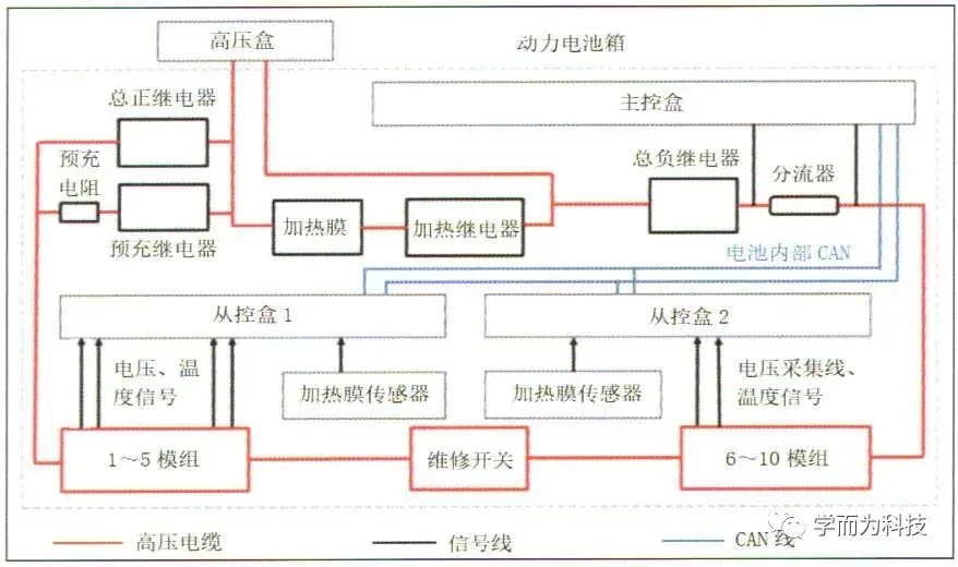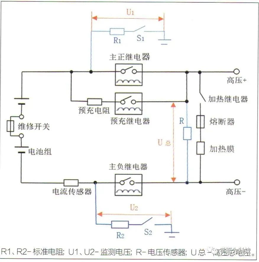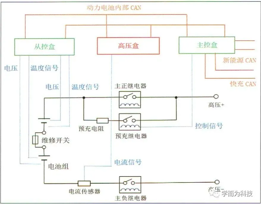 (4)高压盒作用。如图7所示:①监控动力电池总电压,包括主继电器的内外四个监测点(主正继电器内、主正继电器外、主负继电器内、主负继电器外);②监测充放电电流;③监控高压系统绝缘性(见后面介绍);④监控高压连接情况;⑤将以上监测到的数据传送给主控盒。