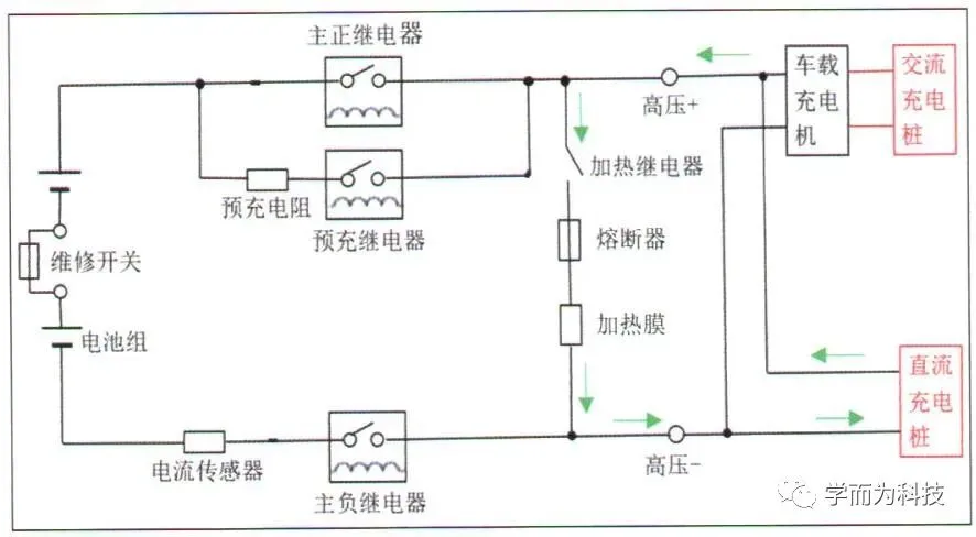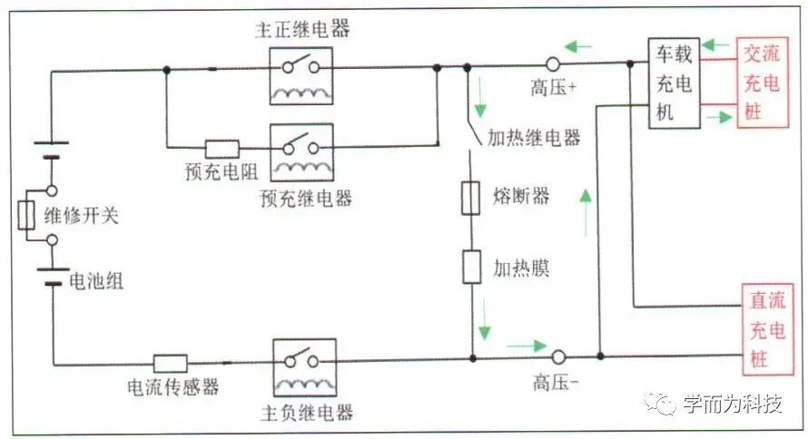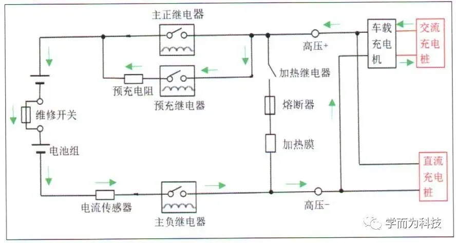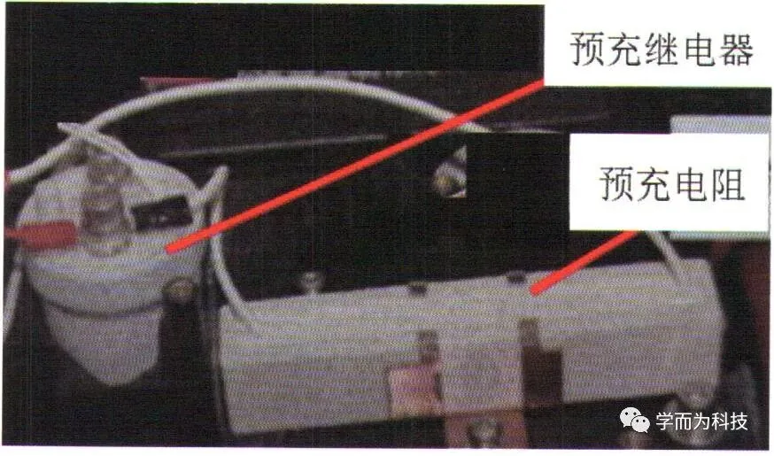 (2)预充继电器、预充电阻,如图10所示,由BMS控制,作用是接通/断开动力电池预充正极。预充电阻一般为100Ω,目的是通入小电流,预充电时检测单体电池有无短路;上电时先用小电流给电机控制器和电动压缩机控制器的电容器充电,因为电容器在充电开始时处于短路状态。