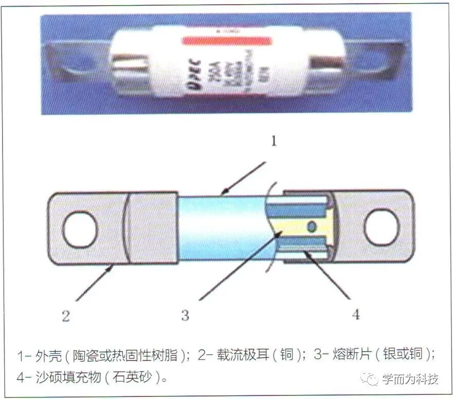 (4)高压熔断器,如图11所示,作用是防止放电过电流,防止能量回收过电流。内部是银熔断片和石英砂,具有快速熔断的特点,一般规格为250A,500V。直流熔断器不同于交流熔断器,交流电正弦波交替传导,每周波有过零点,此时电量值最低电弧容易熄灭。直流电是恒定电压,当出现短路故障,依靠熔断片迅速熔化以及石英砂扩散吸附和冷却熄灭电弧。带有维修开关的纯电动车,高压熔断器装在维修开关内,方便更换。图11 高压熔断器