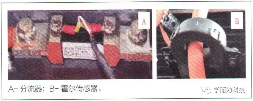 (5)电流传感器,型式有分流器和霍尔传感器两种,如图12所示。分流器是一个阻值很小的电阻,当有直流电通过电阻时产生电压降,根据欧姆定律,电流=电压/电阻,就可计算出电流值。霍尔传感器是半导体材料制成的磁电转换器件,高压电缆穿过该器件,电缆周围产生磁场;传感器输入端通入电流,输出端产生与高压电缆电流成比例的霍尔电势,就可计算出电流值。