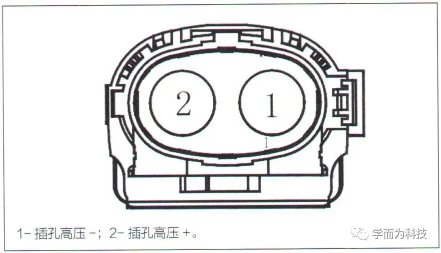(7)高压插座,用来连接通往高压盒的高压电缆,EV200电动车高压插座如图14所示,插孔1为高压-,插孔2为高压+。
