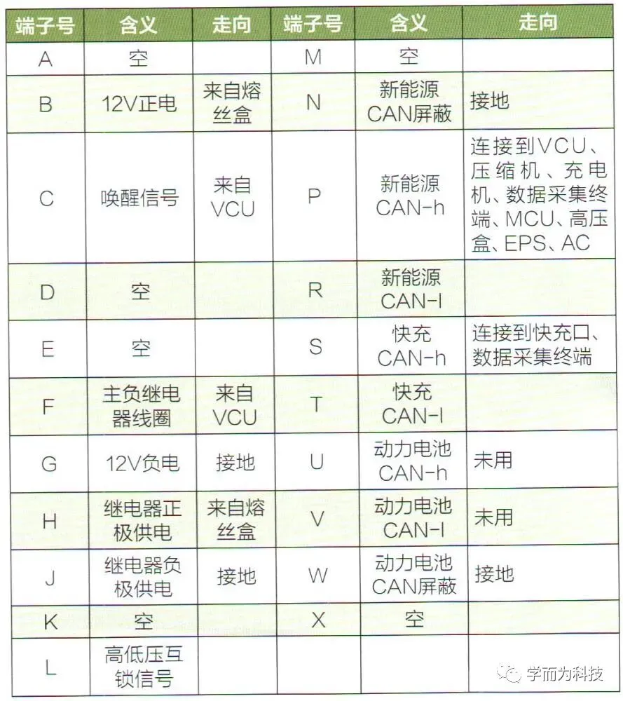 (8)低压插座,用来连接低压线束,北汽新能源EV200的低压插座示意图如图15所示,端子含义见表2。