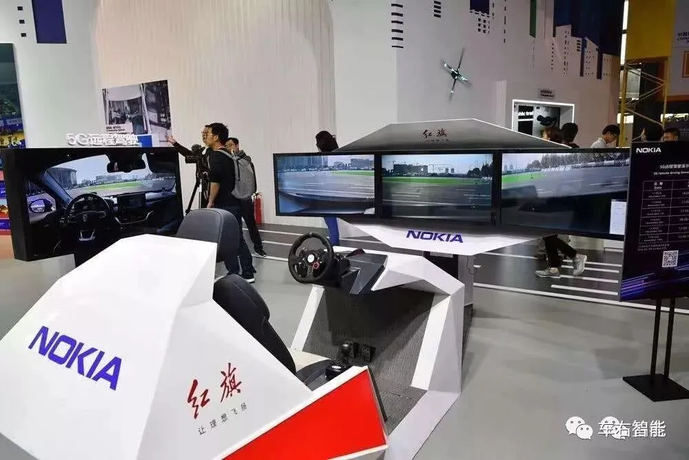 这几天在上海的进博会上,Nokia展示了基于5G的远程驾驶平台(车辆实体的合作方是红旗)。在上海虹桥展览馆内,通过5G网络远程驾驶一辆位于展览馆北广场室外自动驾驶场地上的一辆红旗改造车,如下图: