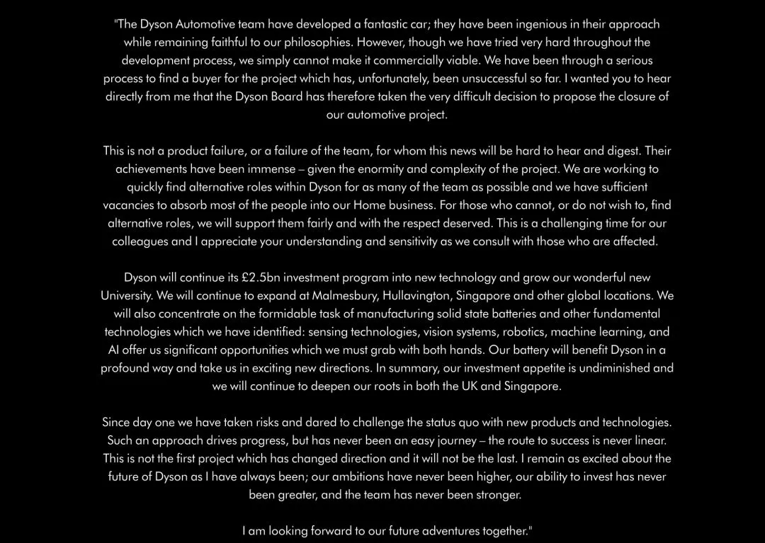 北京时间昨晚,戴森发布公告宣布停止造车,原因是「该项目在商业上不可行」,也就是说戴森认识到自家重金投入的汽车项目赚不了钱。戴森创始人詹姆斯·戴森的内部信称:「这不是产品失败,也不是团队失败。」事实上,戴森已经成功开发出了原型车,产品非常符合戴森的理念,但可惜在商业上并不可行。内部信还透露了几个关键信息,戴森曾试图出售汽车项目,但苦于没有买家接盘,所以不得不停止该项目,接下来的戴森将把目光瞄向固态电池、视觉系统,机器人技术,机器学习、AI 相关技术。砍掉了汽车项目之后,关于团队人员的去留问题,戴森也在内部邮件中作出了明确的说明。该部门一共有 523 名员工,其中 498 名在英国,戴森将努力为绝大多数人在公司内部寻找其他岗位,他们的家电业务有足够的空缺岗位;如果戴森不能妥善安排或者有员工不想再留在公司,戴森会尊重并支持他们的选择。2017 年 9 月,同样是一封内部邮件,70 岁的英国首富詹姆斯·戴森借着几张设计草图向全体员工宣布正式进军造车业,彼时的目标是 2020 年推出新车。规划显示,戴森将投入 20 亿英镑,其中一半将用于电池的研发。种种迹象显示,造车绝对不是戴森的临时起意。从侧面来讲,昔日的功夫下得有多深,今天之放弃就有多么的艰难。故事的起因源自詹姆斯·戴森由来已久的一个梦想,和很多电动汽车行业蜂拥的「投机者」不同,戴森老爷子看起来可能更像个「环保主义者」。詹姆斯·戴森说他从 1990 年就开始努力解决汽车尾气问题,但是当时没什么人关注他的研究领域。他还曾经写过学术报告分析柴油车尾气排放与老鼠致死的课题,但是没人搭理他。在开发吹风机、风扇和空气净化器的过程中,戴森在电机、储能系统、流体动力学和暖通空调系统方面有了很深的技术积累,詹姆斯·戴森认为,电动汽车让戴森「终于有机会把所有的技术整合至同一款产品中,不需要从排气管过滤尾气,今天我们有能力从源头上解决它。」前文我们说到的是 523 人团队其实早从 2013 年起便开始搭建,戴森相继挖角了前劳斯莱斯、路虎、宾利、特斯拉、英国豪华跑车制造商阿斯顿·马丁等诸多车企的研发、技术人才。其中全球生产研发主管是阿斯顿马丁前工程总监 Ian Minards,其汽车商业总监 Andy Gawthorpe 之前曾担任捷豹路虎市场战略和规划总监,而工程主管 John Stamford 是梅赛德斯 AMG 英国 F1 发动机部门电子主管。今年 4 月,英菲尼迪前全球总裁罗兰·克鲁格也被挖到了戴森,成为汽车项目的负责人。2015 年 10 月,戴森斥资 9000 万美元收购了美国固态电池公司 Sakiti3。相比三元锂电池,固态电池在能量密度、电池形态、安全性等方面均有着更好的表现,一度被认为下一代动力电池的最佳选择。2016 年 3 月,英国政府意外泄露了戴森的「造车计划」。彼时英国政府在基础设施建设计划中决定,为戴森的电池技术开发提供 1600 万英镑补贴,最初说明资料中明确写着「使用新型电池开发电动汽车」,随后这一说法又被快速修改了。2017 年 3 月,戴森宣布联合 Google 和 Facebook 共同出资 25 亿美元,计划将位于英国 Hullavington 城的前皇家空军基地改造成为研究院,这个研究院将重点研究 AI、机器人以及其他前沿科技,包括电池和视觉系统。更重要的是,戴森原型车也将在该基地进行原型设计和工程测试。得电池者得天下,但今天的新造车中几乎没有像戴森一样如此着重投入电池自主研发的,大都选择购买供应商的成熟电芯进行打包。其中更不乏购买底盘、购买设计,东拼西凑在短时间内攒出一台车的玩家。詹姆斯·戴森曾经在接受英国卫报采访时是说:「戴森原型车还没有打造,底盘也没有现成的,一切都是从草稿开始。」从 0 到 1,两年内做出一台合格的量产电动车,虽然今天很多新造车宣称可以做到,但这一点恐怕戴森不太敢相信,他们把量产计划又往后推迟了一年。有趣的是,前者大都是「半路出家」的互联网公司,后者则是在电机、空气动力学上深有积累的科技公司。从草稿画起的戴森在今年 5 月终于放出了车辆的初稿图纸,这算得上是戴森汽车项目披露以来为数不多对外公开的产品信息了。从图纸上看,这明显是一台 SUV 车型,三排座布局。车长 5 米左右,车高 1.65 米,比很多 SUV 都要低,而轴距则达到了可怕的 3.3 米,极为倾斜的前挡风向风阻妥协,整车看起来偏向 MPV 的造型。