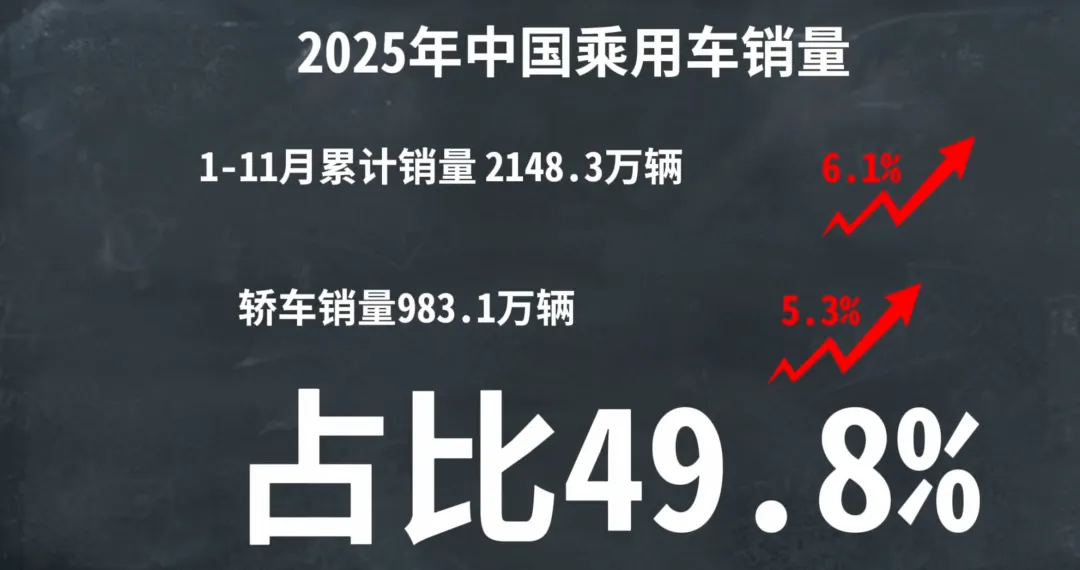 好,咱来细说。为啥说轿车没做好就不强,数据层面,即便是SUV大量上新的2025年,根据有关数据,轿车销量仍然占据整体市场49.8%,你就说把轿车做好是不是很重要?感知层面,在过去的很多年里,国内的轿车市场仍然是合资主导,自主轿车只能夹缝中求生存。而2025年,从前11个月数据看,中国品牌拿下轿车销量榜TOP10中的六席,前三均为中国品牌,其中吉利星愿有望单车年销量突破50万台,而且TOP10中还有像小米SU7这样20万价位的中国轿车。