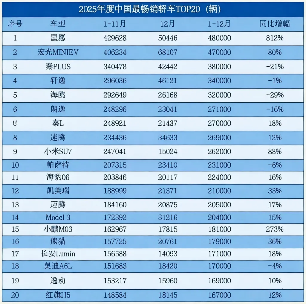 如果说,前些年中国品牌有一两个轿车能挤进销量榜,打破合资垄断,那么2025年这份榜单,可以说中国轿车已经瓦解了合资主导的局面,开始掌握话语权了。