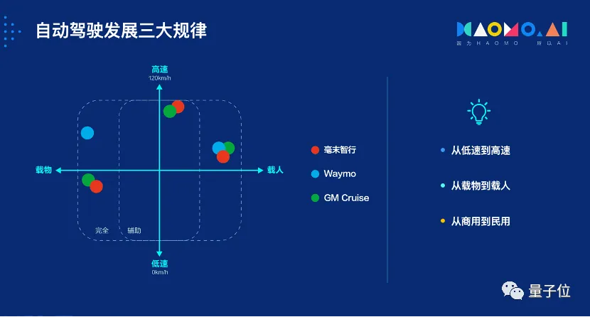 2021年3月毫末首提自动驾驶商业发展三定律——「从低速到高速,从载物到载人,从商用到民用」。