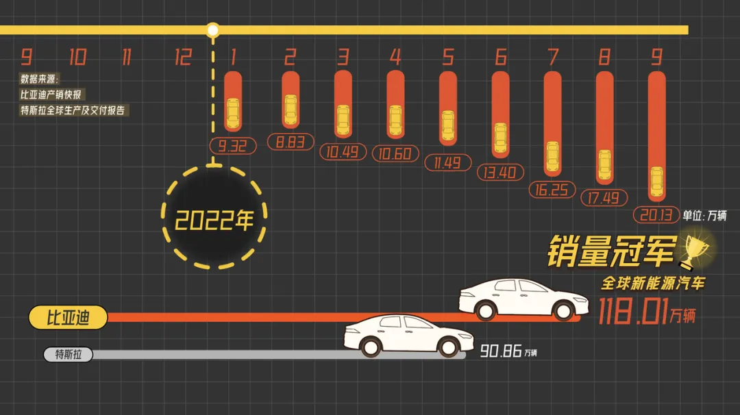 截至 2022 年第三季度,比亚迪今年累计交付 118.01 万辆新能源汽车,超过特斯拉的 90.86 万辆,是全球新能源汽车当之无愧的销量冠军。