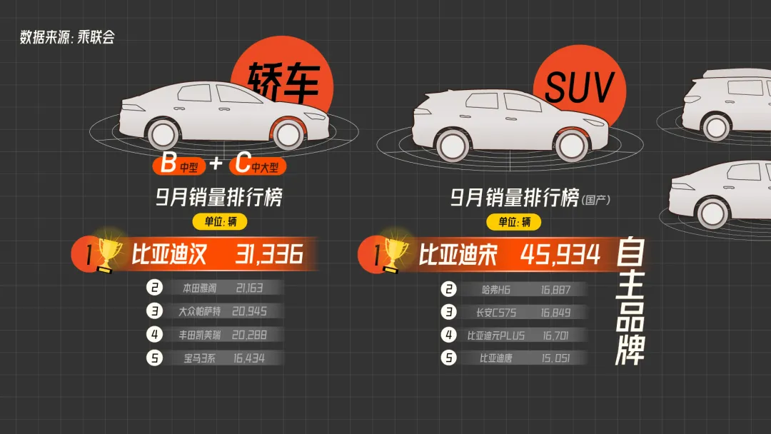 汉家族 9 月更是劲销超 3 万辆,斩获 B+C 级轿车市场双料冠军,霸榜中大型轿车市场。
