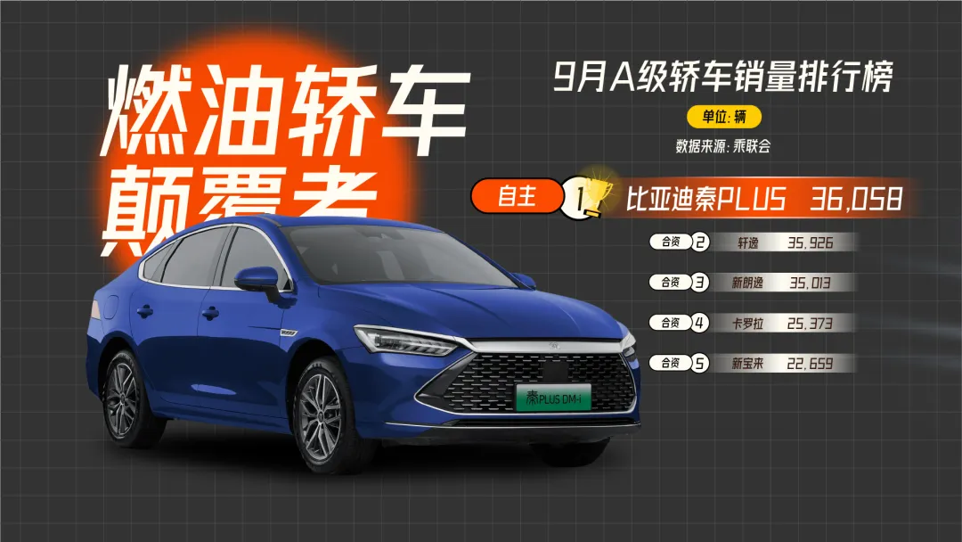 而在今年 9 月,比亚迪秦 PLUS 做到了,它以 36058 辆的成绩,超越了第一的轩逸,拿下了 A 轿销量冠军,打破了合资品牌常年垄断 A 轿市场的格局,坐实“燃油轿车颠覆者”之名。