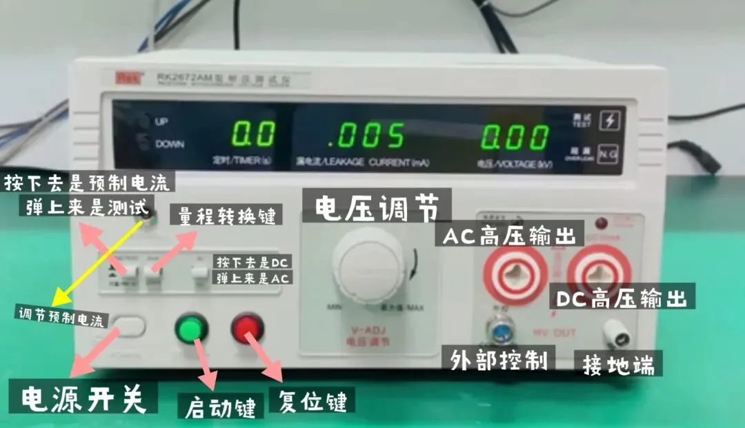 以美瑞克RK2672AM交直流耐压仪为例,该耐压仪输出高压交流直流都是5kv,输出漏电流交流最大20mA,直流最大10mA。