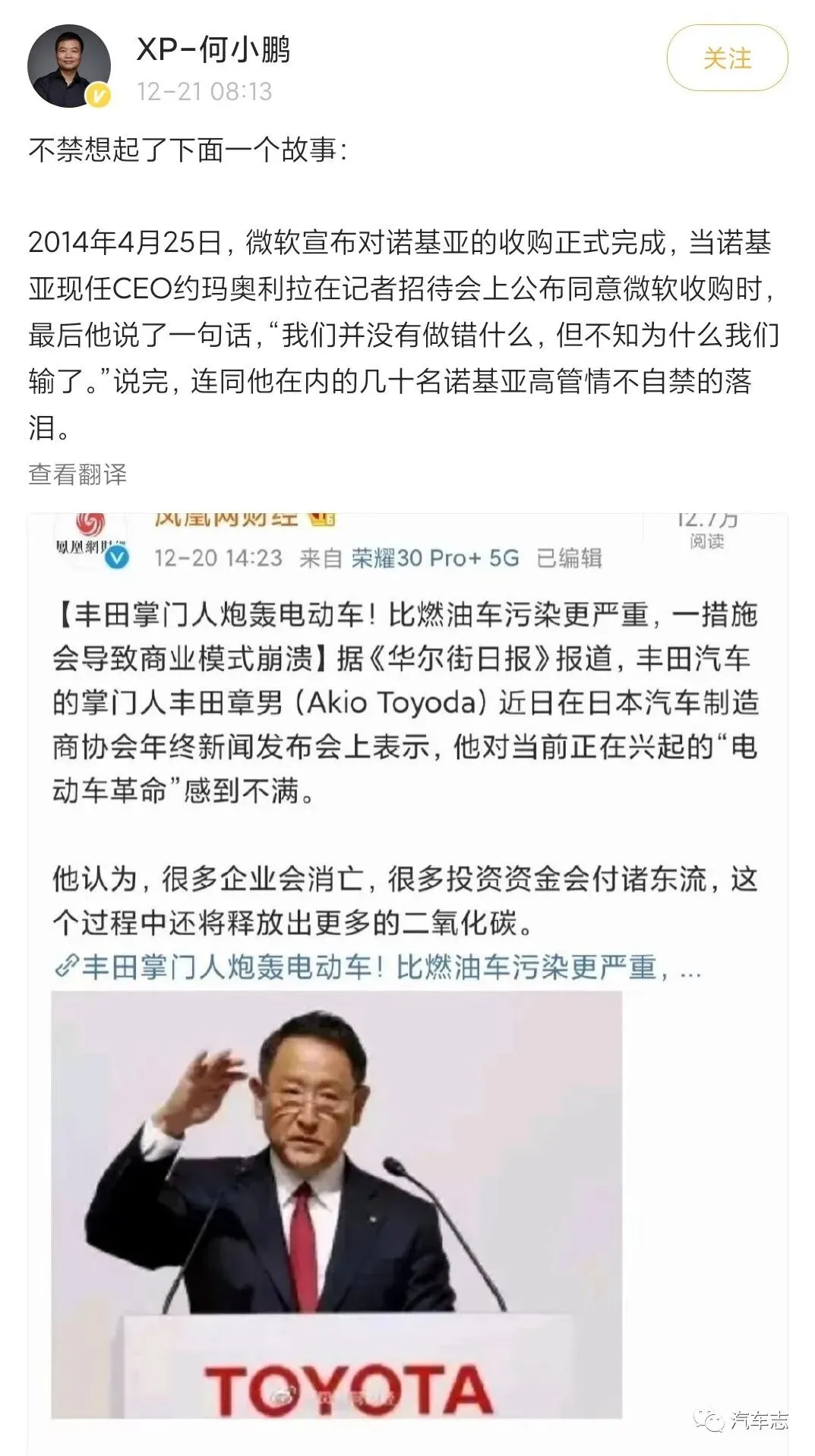 当然,以丰田章男在汽车界的地位而言,这样的言论一定会引发一些业内人士的讨论。小鹏汽车总裁何小鹏就在微博上进行了“回怼”,以微软收购诺基亚的例子对丰田章男的这一番话进行了调侃和回击。虽说这一例子在笔者看来还不够贴切,但也能从侧面反映出一个问题:一场关于新能源与传统之间的碰撞已经开始。
