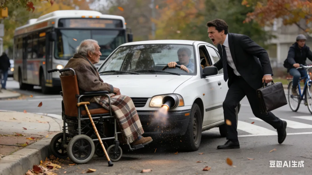 我見状气不打一处来, 这是哪家教出来的混账后生呐? 我忍住气愤, 紧赶几步到了轮椅旁边, 一边安慰残疾老人“不急不急”,一边用力将坐着残疾老人的电动轮椅连拖带拉地挪到人行道边,目送小轿车一踏油门“昂——”,司机口吐一个烟圈儿,得意地长晌一声喇叭“叭~”、呼——地往前一窜得意地扬长而去。