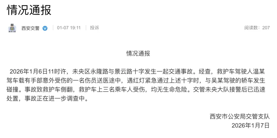 2026年1月6日11时许,未央区永隆路与景云路十字发生一起交通事故。经查,救护车驾驶人温某驾车载有手部意外受伤的一名伤员送医途中,遇红灯紧急通过上述十字时,与吴某驾驶的轿车发生碰撞。事故致救护车侧翻,救护车上三名乘车人受伤,均无生命危险。交管未央大队接警后已迅速处置,事故正在进一步调查中。