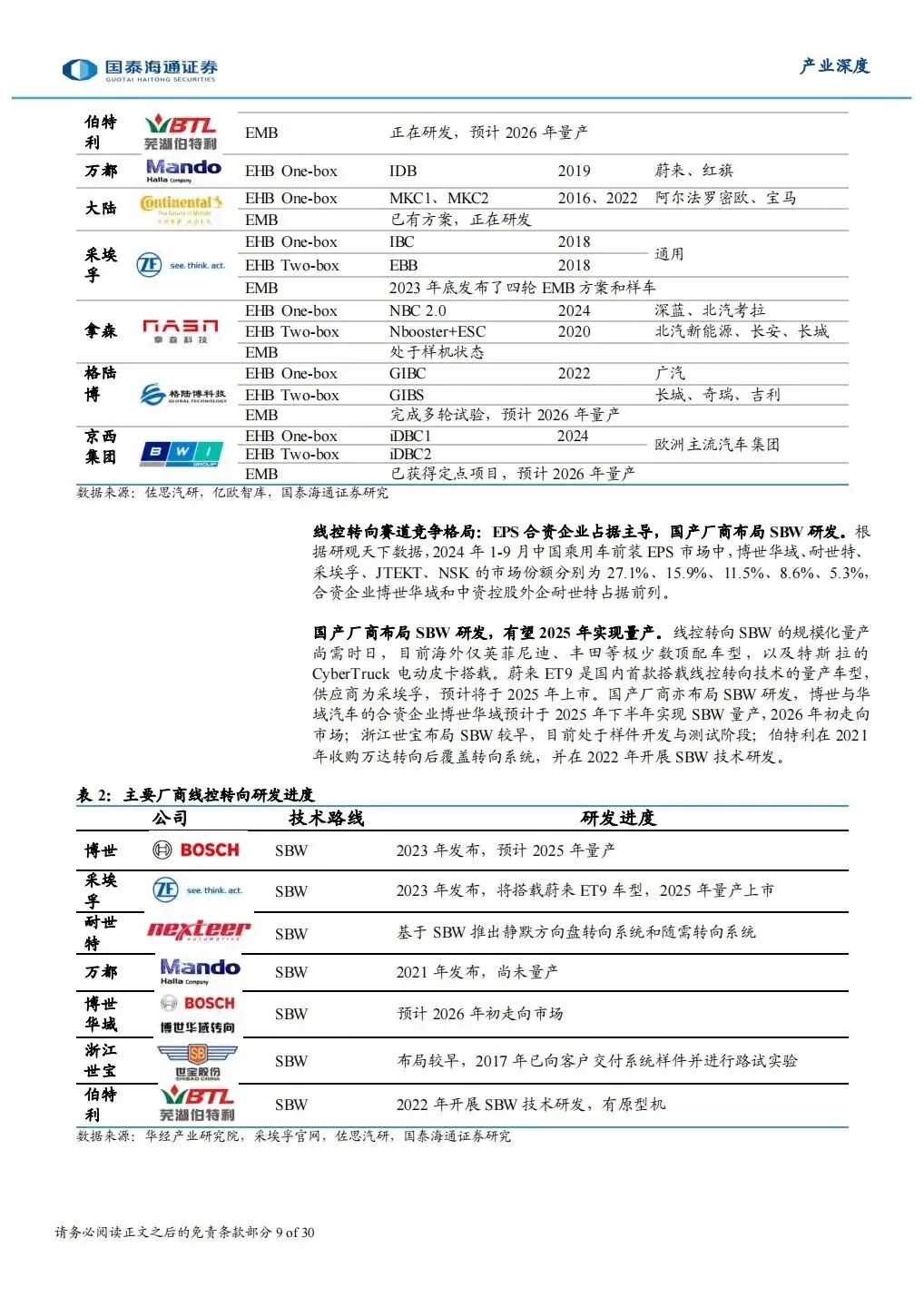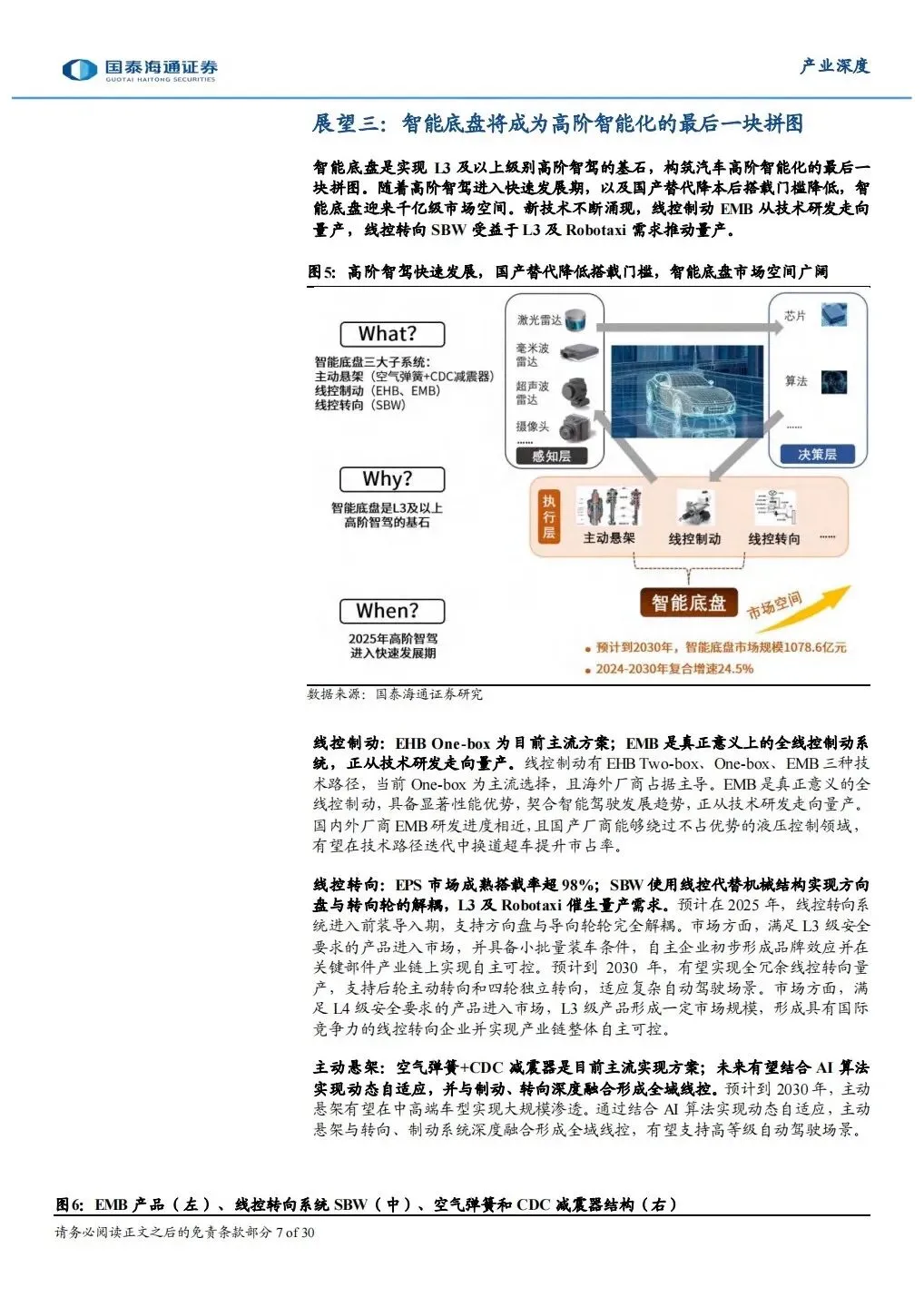 智能底盘迎来千亿级市场空间,新技术不断涌现,线控制动 EMB 从研发走向量产,线控转向 SBW 受益于L3及 Robotaxi 需求推动量产。