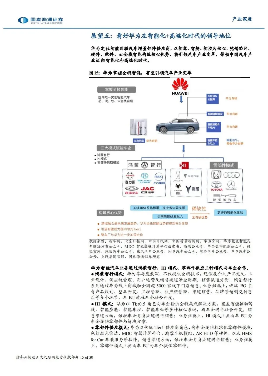 华为凭借芯片、硬件、软件、云全栈智能构筑核心优势,将引领汽车产业变革,带领中国汽车产业迈向智能化和高端化时代。
