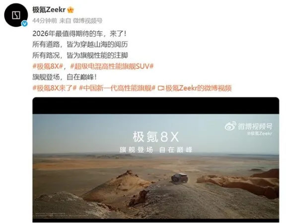 新年刚过,极氪就扔出了2026年的第一个重磅炸弹。1月5日,极氪官方正式宣布旗下全新超级电混高性能旗舰SUV命名为极氪8X,并同步发布了新车轻伪装亮相视频。官方给这车贴的标签是"2026年最值得期待的车",口气不小,但看看配置单,确实有底气说这话。