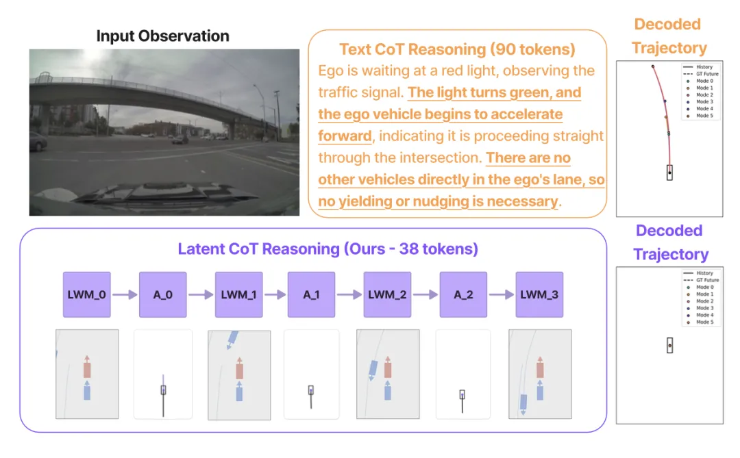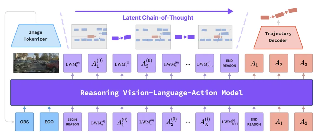 目标是设计一种紧凑、与动作对齐的推理过程,该过程在潜世界模型状态下执行潜反事实推演,并将思维链(CoT)保持与最终轨迹输出相同的词汇表。