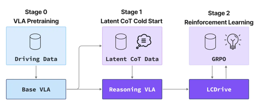 本文通过三阶段流程(如图所示)训练 LCDrive。首先,从预训练的非推理 VLA 模型开始,通过教师强制学习的方式,使用真实世界模型状态和模型自身提出的推理动作来对模型进行冷启动,从而初始化潜思维链。在此过程中,同时训练一个小型 LWM 预测头,用于在推理过程中根据提出的动作预测 LWM 嵌入。接下来,应用强化学习 (RL) [16] 来改进这种初始的潜推理框架,并使用轨迹级奖励来提高最终动作预测的性能。