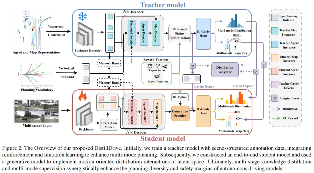 DistillDrive的核心设计在于构建了"教师-学生"的知识蒸馏体系,通过多模态规划模型(教师)指导端到端模型(学生)学习丰富的驾驶决策知识。其整体架构如图2所示,主要包含三个关键模块: