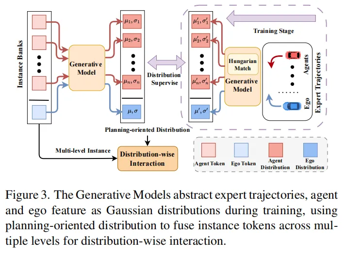 - 生成式分布交互:如图3所示,将专家轨迹和自车/智能体特征抽象为高斯分布,通过分布级交互学习运动先验知识