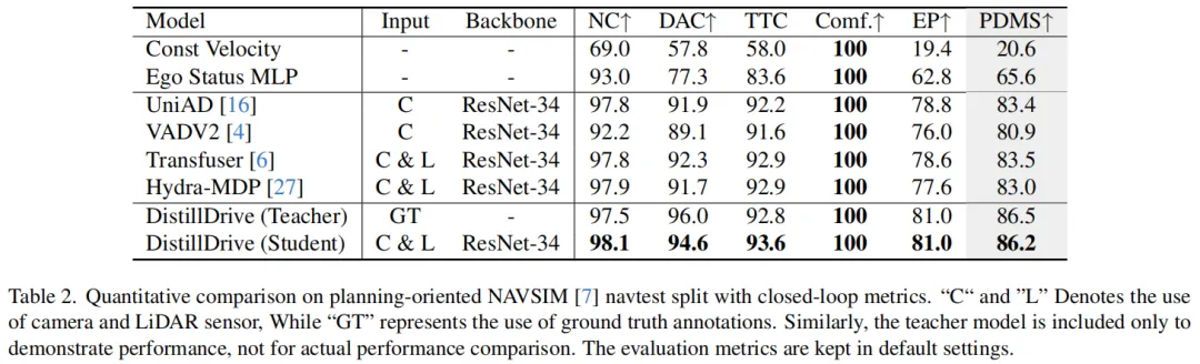 NAVSIM数据集的闭环仿真结果(表2)更能体现其实际应用价值:
