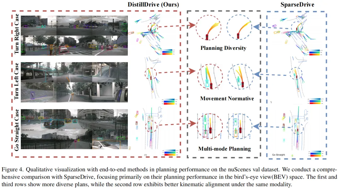 定性分析(图4)展示了DistillDrive在不同场景下的出色表现: