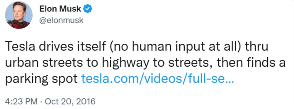 在视频发布后,CEO马斯克更通过推特加以传播。他在推文中写道:“特斯拉可以在完全无人干预的情况下,从城市街道自动驾驶至高速公路,再返回街道,最后找到停车位自动泊车。”