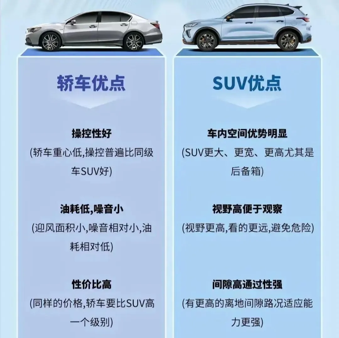 其实SUV和轿车各有各的优势。SUV的优点是视野好、安全性相对更高、空间利用率不错,而且外观确实更有气势。缺点是油耗普遍偏高、操控性不如轿车、风阻大导致高速噪音也大一些。