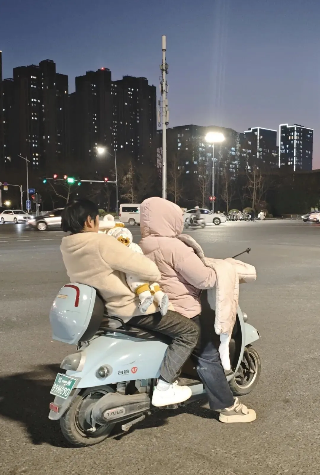 郑州的冬夜,风是带着棱角的,刮在脸上像小刀子似的。我看着她们仨挤在小小的电动车上,妈妈的挡风板被风吹得飘起来,姥姥把宝宝往怀里又搂了搂,那副模样,让我心里瞬间揪了一下。电动车行驶在车流里,周围是呼啸而过的汽车,那辆小小的车,在钢铁洪流里显得格外单薄,我甚至能想象到,妈妈骑车时要多用力,才能稳住车身;姥姥抱着宝宝时,要多小心,才能隔绝冬日的寒意。
