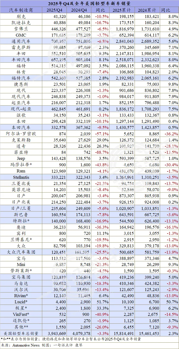 Autonews统计的已公布数据的大多数车企表现来看,虽然3个月的连续下跌导致四季度的销量仅收于394.4万辆,跌幅为3.3%,但得益于前三季度同比分别增长4.8%、2.7%和6.1%,因此2025年美国轻型车新车市场同比仍增长2.3%,销量约为1581.4万辆。