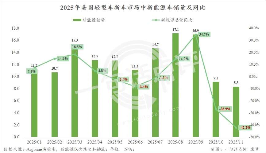 同时,该机构的数据显示,去年10月开始美国电动车销量已陷入大幅走跌,10月同比下跌26.9%至9.1万辆,11月下跌42.2%至8.3万辆。