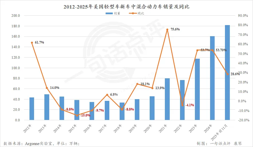 根据Argonne的统计数据,2025年前11个月美国共售出182.0万辆混合动力车,已超过2024年全年的160.9万辆。