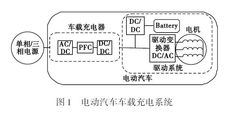 随着环境污染和能源短缺问题愈演愈烈,电动汽车的研究也受到了极大关注。最近的一项研究显示,电动汽车的销量将在2030年占到全球汽车市场的30%左右。虽然交通电气化的发展已经取得一定进步,但“充电不便”和“里程焦虑”仍被认为是阻碍电动汽车发展的重要因素。而改善这些问题的一个重要途径就是开发IOBC,传统的车载充电器安装在电动汽车内部,通过交流电源为电动汽车充电,其结构如图1所示。