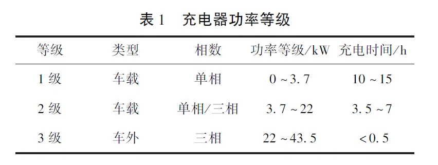 目前各个电动车汽车制造商都在扩大电池的功率密度,并提供方便可靠的充电基础设施。通常电动汽车可在住宅区或者公共插座充电,根据充电功率等级和充电时间可分为三级,如表1所示。